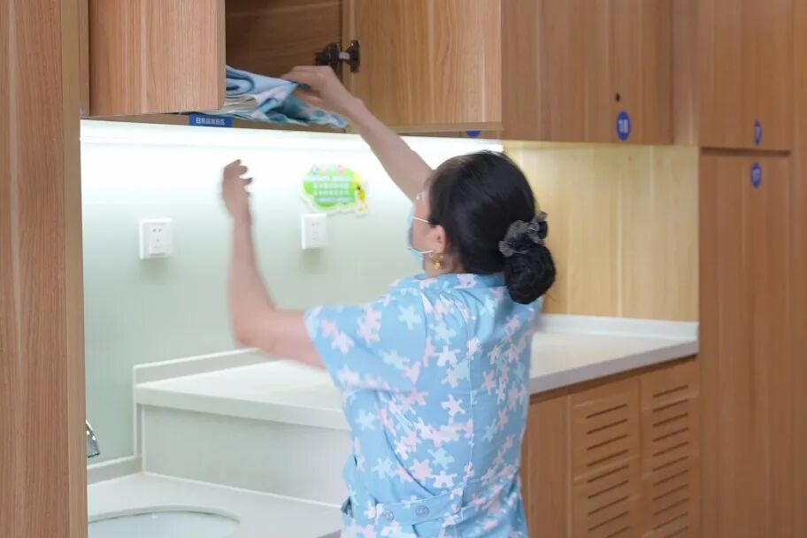 除此之外,标准化病房也为护工团队打造了独立的收纳空间,让专业护理工具不再与患者物品交叉存放,避免了因寻找工具而耽误时间,真正实现了高效、安心的工作状态。这不仅是对护工职业的尊重,更是对患者安全的守护。