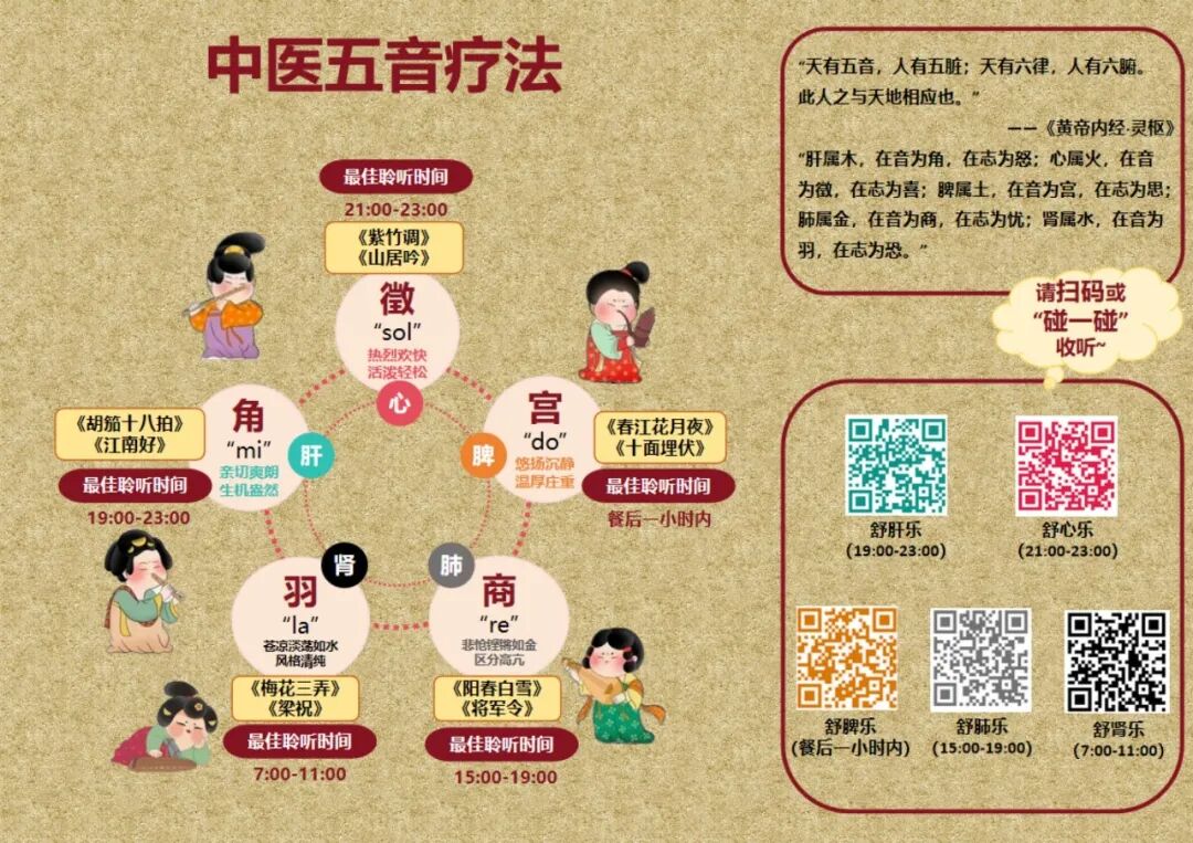 古人云:“乐者,亦为药也。”在标准化病房的病墙上,张贴着不同时间段的音乐二维码,扫码即可听取根据子午流注排列的特定音乐,这些音乐通过有规律的声波振动,与人体生理振动吻合,产生共振和共鸣效果,从而调节植物神经系统功能活动、调节激素释放,能够帮助患者: