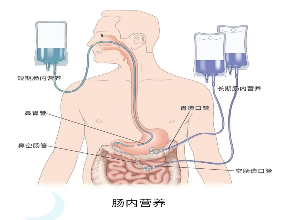 医学上营养支持包括肠外营养(PN)、肠内营养(EN)和口服营养补充(ONS)。对于不能经口摄食而胃肠功能正常的患者,首选肠内营养的方式给予营养支持,肠内营养的实施途径分为鼻饲和造瘘。