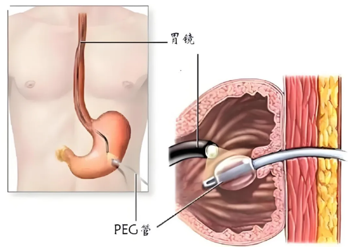 经皮内镜下胃造瘘术,简称PEG,是肠内营养的一种方式,指在电子胃镜的指引下,将造瘘管经腹壁放入胃腔中,然后通过造瘘管将营养液输入至胃腔、肠腔内。该手术属于微创手术,是一种可逆性的辅助治疗措施,有助于改善患者的营养状况。在患者恢复自主吞咽功能后,可以拔除造瘘管,拔除后1~2天内造瘘口即可闭合。