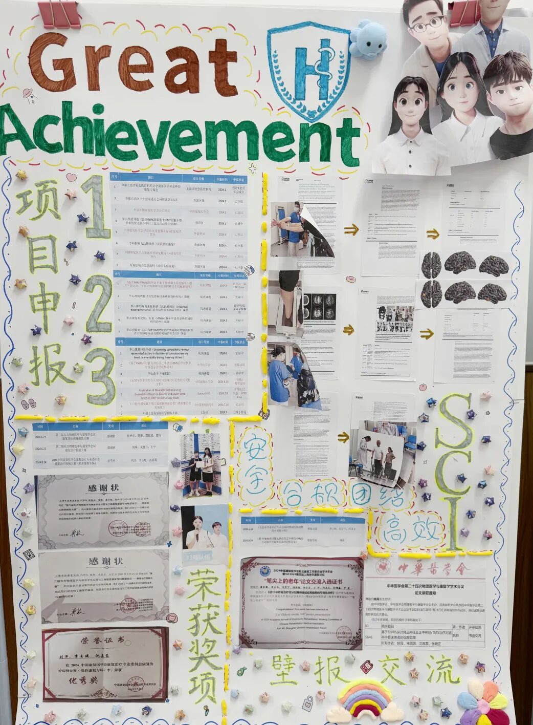 上半部分展示的是小组成员可爱的自画像,紧接着是展示工作场景和医院环境的照片。这些照片捕捉了组员日常工作的瞬间,从治疗师与患者的互动,到小组成员使用的各种先进设备,每一张照片都记录了我们为患者康复所做的努力。